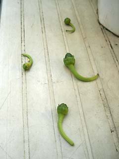今日もよく落ちてます。 そして ほどよく喰われてます。 虫喰いの跡はあちこちにあるのだけど肝心の虫の姿は見当たらない。 ヨトウかな、と思って土をほじくりかえしてみたけどいないんですよね〜 あちこちチェックしてたらこんなもん見つけてしまいました。 虫の卵。かなりきもい。 (拡大クリック) 見た目も大きさも金の胡麻。 即効駆除しましたが何の虫の卵なのか気になりますです。 収穫しました↓ジャンボ3兄弟 福耳、ほんのり色づいてます。 焼いて思いきりカブりついたら激辛だったです。