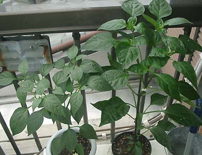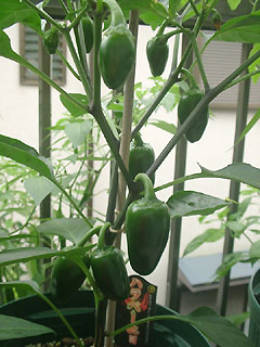 ↑ 定植する前に比較してみよう( ・∀・)σ 左は園芸店で買ったハラペーニョで、右は自家採取した種から育ててるハラペーニョ。 もうね、幹の太さからして全然違うの。小指と親指ほどの差がありますよ。 葉の大きさもご覧のとおり。 培土量、施肥、日当たり、栽培条件はほぼ同じなのに、ここまで差がでるものなんですねー これだけ立派な苗ならば収穫の方も⋯と、つい期待してしまうのですが なかなか思うとおりにはいきませぬ。 庭の野菜プランターに定植した種蒔きハラペーニョ組は 結実はするものの数は少なく、実も一向に大きくならない状況なんですね。 一方、これは園芸店で買った苗のかたわれ。 (苗を買った時、2本植えになっててそのうちの1本) 8号スリット鉢に定植してベランダで育てているんですけど このように、たわわに実ってます。 ↓ もう少し日がたてば、状況が逆転しているかもしれません。 それはまたの楽しみということで。