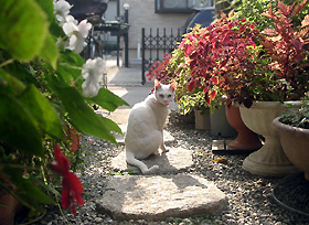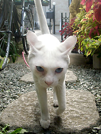 先月くらいから若い白ネコが遊びにくるようになりました。どこの飼い猫かは謎。はじめはかなり警戒されていたんですが今ではすっかり仲良し。スタイルの良いなかなかの美猫です。避妊手術してないようだけど大丈夫かな??このあたりはノラや外飼いの雄ネコがすご〜く多いのです。