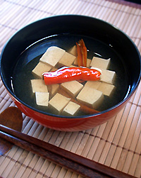 干し椎茸と煮干しを8時間水に戻す。椎茸と煮干しの戻し汁に戻した干し椎茸、ドジョウナンバンを加え弱火にじっくりかける。塩で味を整え火をおろす1分前にサイの目に切った豆腐を加える。