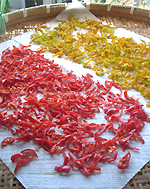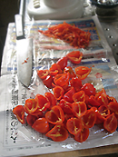 まずは山盛りのハバネロをやっつけよう。 ゴーグル、マスク、厚手の手袋で完全装備。コントとかB級映画に出てきそうな風貌です。ためらいつつも窓は全開。え、もちろん換気のためですよ。人に見られたらそれはもうギャグだと思って諦めるしかないでしょう。