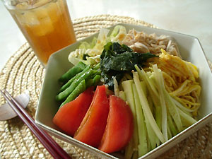 今日は冷やし中華に。冷やし中華には練り辛子派だけどコーレーグースをほんのちょこっと汁に垂らして食べてみたら意外に美味しい。冷やし中華に限らず、ラーメン、焼そば、ビーフン、饂飩、素麺、きしめん、ほうとう等、麺類とは相性がよいですね。