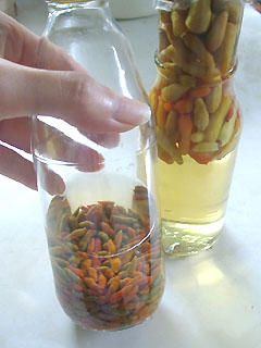 ブログでも何度か取り上げてますけども、うちには沖縄島唐辛子と小笠原島唐辛子で作った2種類のコーレーグースがあります。手に持っている方が小笠原島唐辛子。