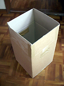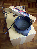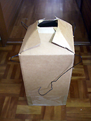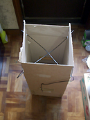 やや。むきだしの針金ハンガーがなんとも貧乏臭い。 もうおわかりでしょう。そう、これは超イケてないダンボールスモーカーです。 クロスしたハンガーに食材ぶら下げて灰皿(未使用)にスモークウッドをのせて着火し筒の下から煙りをモクモクさせるのです。 そうすると美味しい薫製ができるのです。