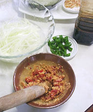 ゴマ油以外の材料を鍋に入れ、木ベラで絶えずかき混ぜながら1時間ほど弱火にかけます。火から下ろす直前に少量 のゴマ油をかけて香りづけ。そして完成です。