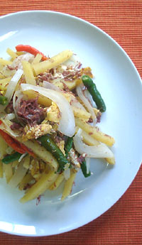 <材料> コンビーフ、じゃがいも、タマネギ、ひもとうがらし、卵、塩、胡椒 1)千切りにしたじゃがいもを水にさらし、水気を切ってレンジで2分加熱。 2)フライパンでコンビーフ、タマネギを炒める。(油はひかない) 3)タマネギに火が通ったら、ひもとうがらしとじゃがいもを加え炒める。 4)塩胡椒で味をととのえ、溶き卵を加えほぐしながら炒める。 PR 2008/09/05(Fri) 00:00:00